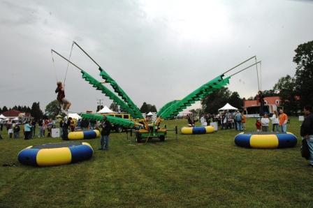 MONKEY MOTION QUAD POD - Monkey Motion Quad Pod is great fun. Up to four people can participate at one time. Each participant is attached and harnessed to two fiberglass poles. The operator lifts up each person individually until they are high enough to jump up and down on mini-trampolines. Participants may do flips forwards and backwards. |